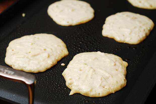Теперь можно жарить блинчики. Смажьте сковороду маслом и выкладывайте тесто по столовой ложке. Когда появляются пузырьки, переворачивайте и дожаривайте с другой стороны. Такие панкейки лучше съедать сразу, хотя мы сомневаемся, что у кого-то они останутся до ужина.